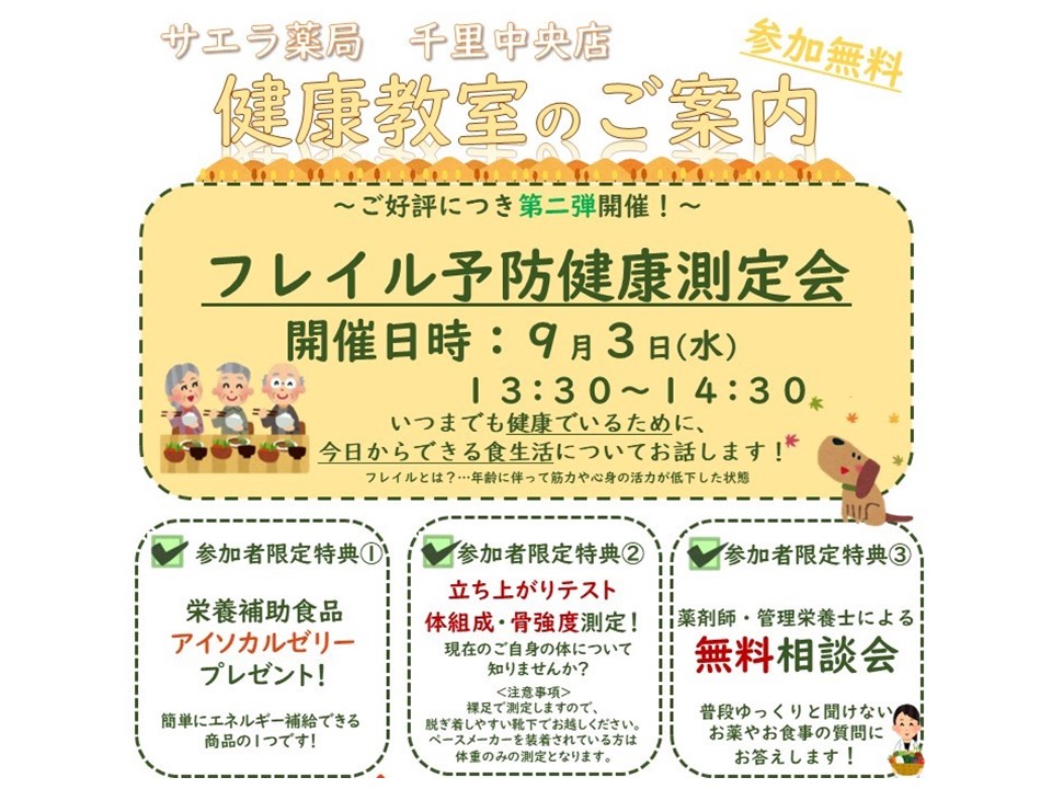 2025年9月3日(水)にサエラ薬局千里中央におきまして、第2弾となる『フレイル予防健康測定会』をテーマに健康教室を開催しました。