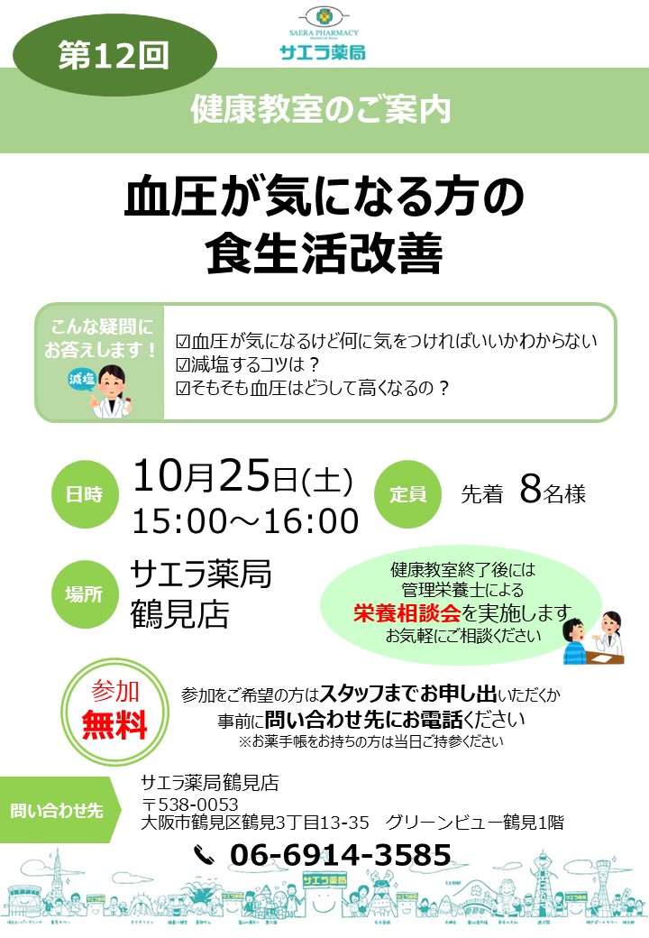 サエラ薬局鶴見店におきまして2025年10月25日(土)15:00~16:00に、管理栄養士による「血圧が気になる方の食生活改善」をテーマにした健康教室を開催しました。